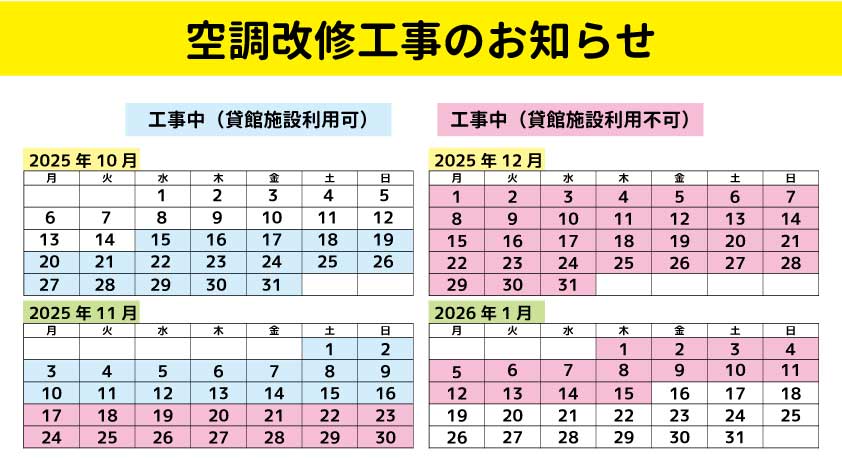 当該期間の内、会議室などの施設を利用できない期間を令和7年11月15日(土)~令和8年1月15日(木)としていましたが、下記日程に変更となりました。