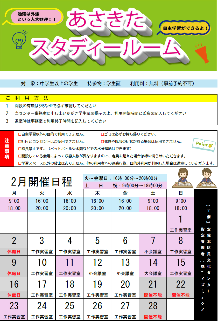【令和8年2月あさきたスタディールーム】の開催日が決まりました!! 2026/01/27 2026年2月の「あさきたスタディールーム」開催日時・会場を発表します。 平日は16時00分~20時00分、 土日祝は9時00分~18時00分でご利用が可能となっております。 放課後もご利用できますので、学生の皆さまは学生証をご持参の上、当センターへお越しください。 尚、会場は日毎に異なりますので、下図の2月開催チラシでご確認ください。 3月以降の開催日については、今しばらくお待ちください。 2月開催チラシのダウンロードはこちら → 2月開催チラシ