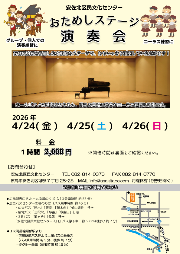 音響反射板を設置したステージを借り切って、楽器の演奏ができます‼