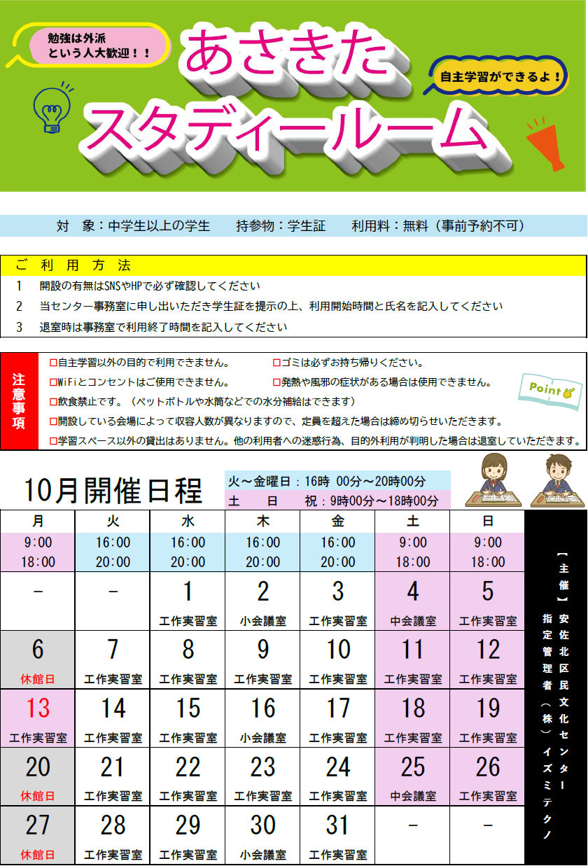 2025年10月の「あさきたスタディールーム」開催日時・会場を発表します。