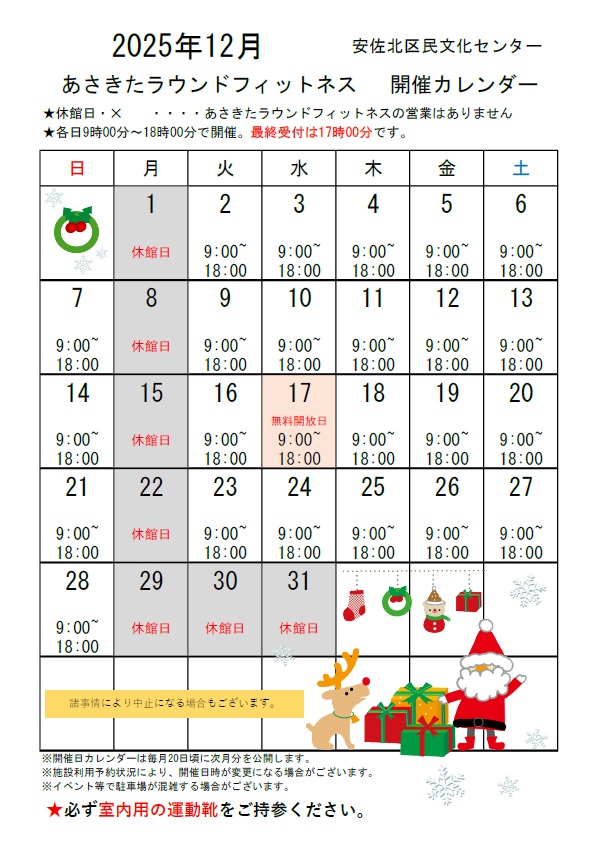 あさきたラウンドフィットネス 12月開催カレンダー