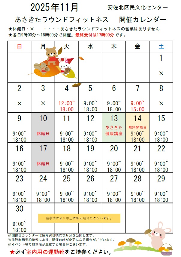 ダウンロードはこちら 令和7年11月17日(月)より空調改修工事の関係で諸室等の貸し出しを中止しておりますが、 通常の窓口サービス及びあさきたラウンドフィットネスは開催しております。 尚、あさきたラウンドフ… 続きを読む