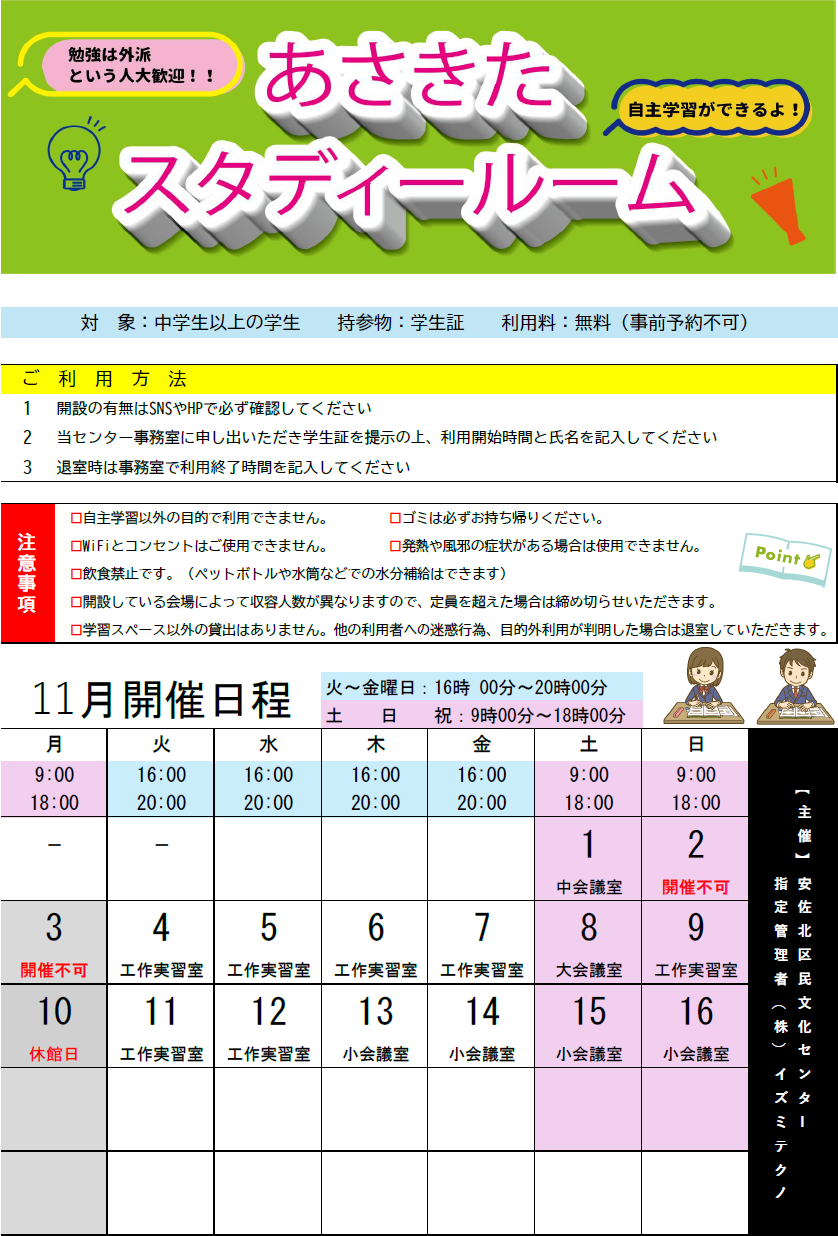 2025年11月の「あさきたスタディールーム」開催日時・会場を発表します。 平日は16時00分~20時00分、 土日祝は9時00分~18時00分でご利用が可能となっております。 放課後もご利用できますので、学生の皆さまは… 続きを読む