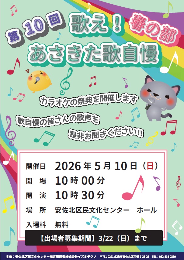 10/12(日)第9回「歌え!あさきた歌自慢」秋の部 を開催します