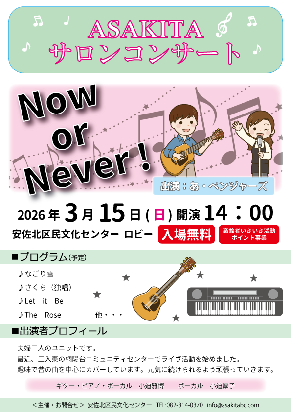 【開 催 日 程 】 令和8年3月15日(日) 14時00分開演 【 会 場 】 安佐北区民文化センター本館ロビー 【 入 場 料 】 無料 【 出 演 】 あ・ベンジャーズ ◆プロフ… 続きを読む