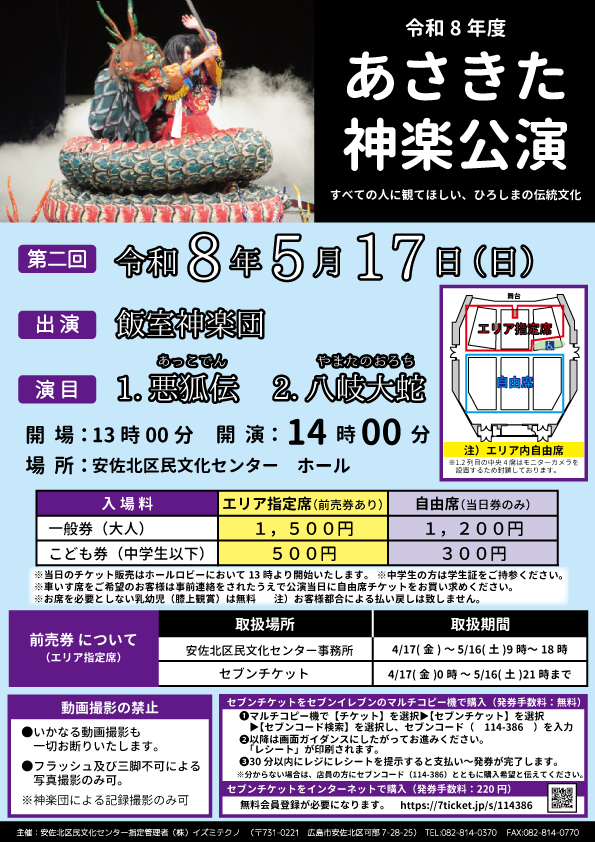 【 開 催 日 程 】 令和8年1月18日(日) 開場13時00分 開演14時00分 【 会 場 】 安佐北区民文化センター ホール 【出演団体および演目】 <出 演>あさひが丘神楽団・宮崎神楽団 <演 目> 1…. 続きを読む