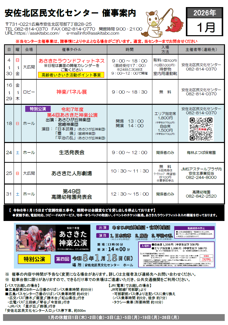 【お詫びと訂正】 5月催事案内の裏面、「あさきたラウンドフィットネス 開催カレンダー」に誤りがありましたので 訂正し、お詫び申し上げます。 <誤>5月5日(月)休館日 ↓ <正>5月5日(月)9:00~18:00 &nb… 続きを読む