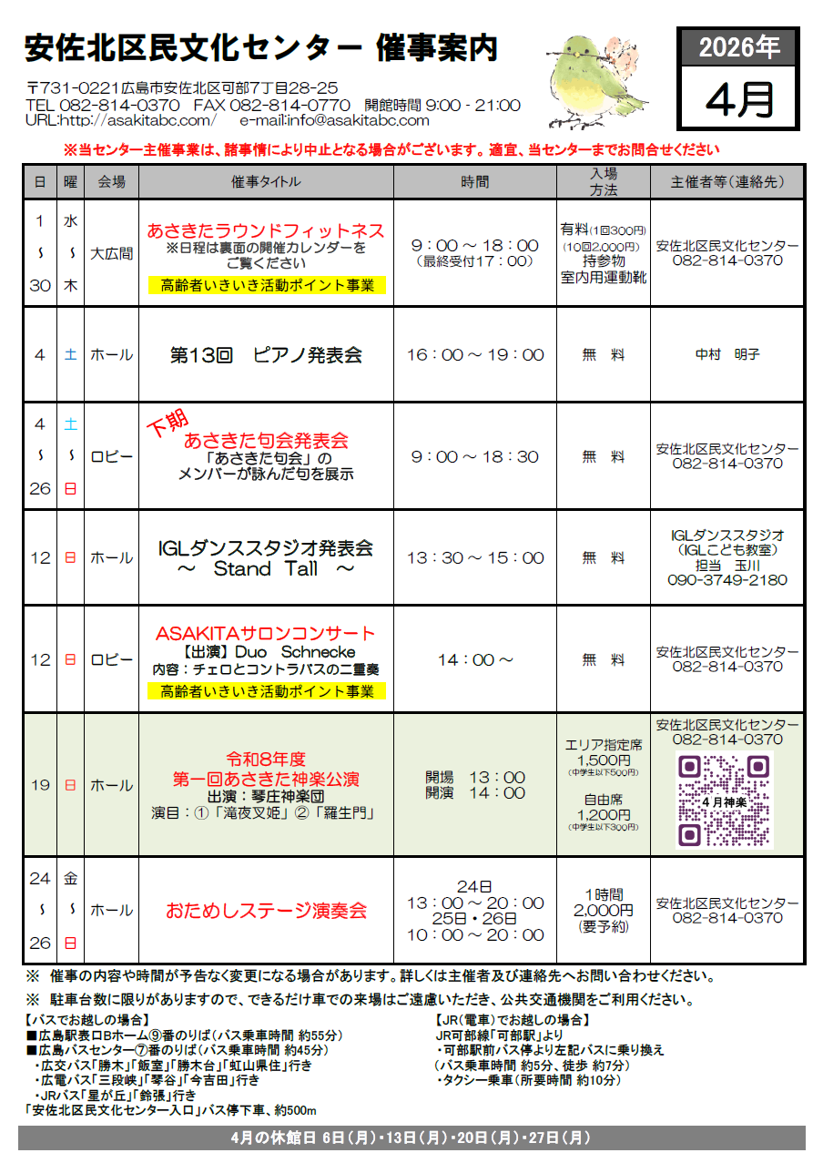 広島市安佐北区での催し物や地域イベントなど盛りだくさんです。どなたでもお気軽にご利用ください。