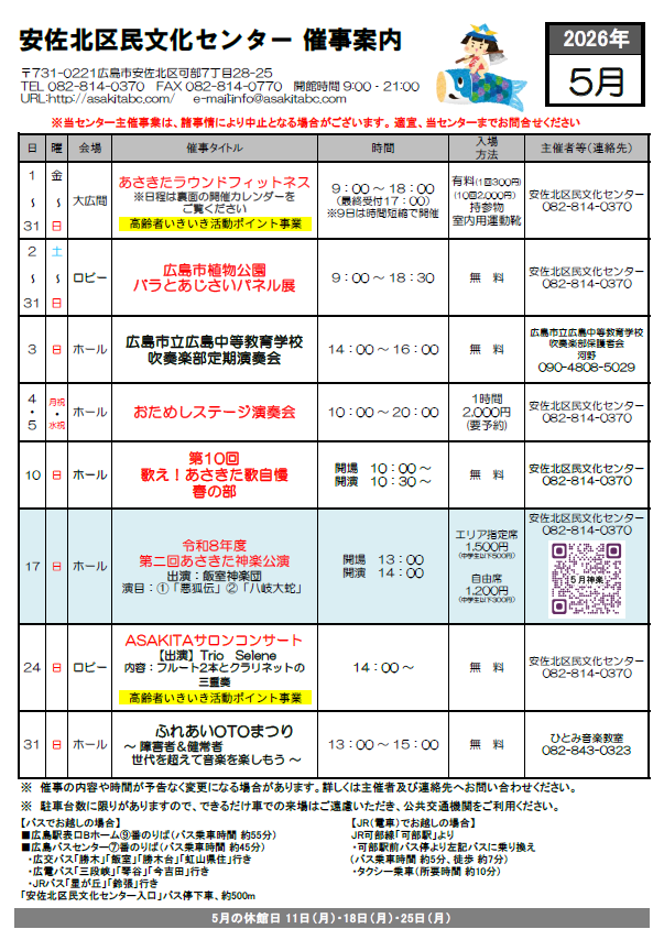 広島市安佐北区での催し物や地域イベントなど盛りだくさんです。どなたでもお気軽にご利用ください。